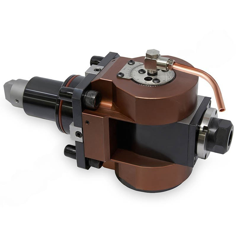 Универсальный фрезерный блок с возможностью изменения угла наклона шпинделя. Подходит для цанг ER20 по стандарту DIN 6499. Диапазон зажима составляет от 1 до 13 мм. Предусмотрено внешнее охлаждение.